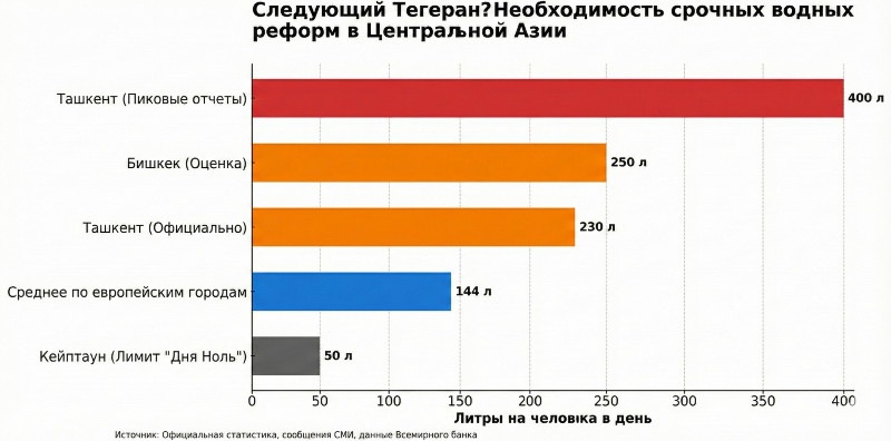 Городская инфраструктура также находится в критическом состоянии. Ташкент, Бишкек, Алматы, Астана и Душанбе выглядят благополучнее, чем они есть на самом деле. Значительная часть водопроводных сетей датируется советской эпохой и поддерживается за счет аварийного ремонта, а не системной замены. Потери воды в сетях достигают 40–70 процентов. При этом потребление воды в столицах Центральной Азии многократно превышает показатели западных стран, где действуют стандарты устойчивого развития. Например, в Ташкенте пиковое потребление достигает 400 литров на человека в день, тогда как в европейских городах этот показатель составляет в среднем 144 литра. Нереалистичные тарифы, не покрывающие расходы на обслуживание сетей, и отсутствие приборов учета лишь усугубляют проблему.