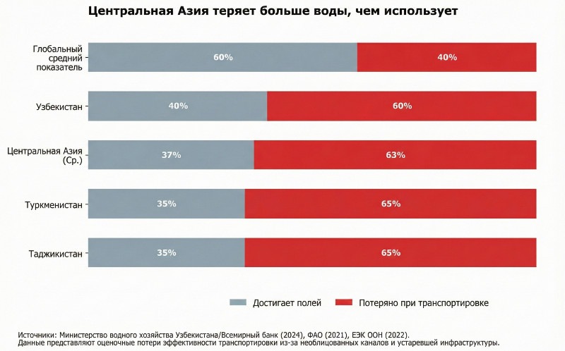 Проблема усугубляется состоянием ледников Памира и Тянь-Шаня, которые питают реки Амударья и Сырдарья. Эти горные системы нагреваются значительно быстрее, чем в среднем по планете, и ледники уже потеряли значительную часть своей массы с 1960-х годов. Несмотря на сокращение ресурсов, регион продолжает расходовать воду с колоссальной неэффективностью. Сельское хозяйство, на долю которого приходится до 90 процентов водозабора, опирается на устаревшие ирригационные системы с открытыми каналами, где потери на фильтрацию и испарение достигают 40 процентов еще до того, как вода попадет на поля.